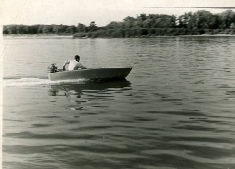 Александр Яковлевич Зинкин (папа) испытывает новую моторку - самую быструю в городке (май 1960)