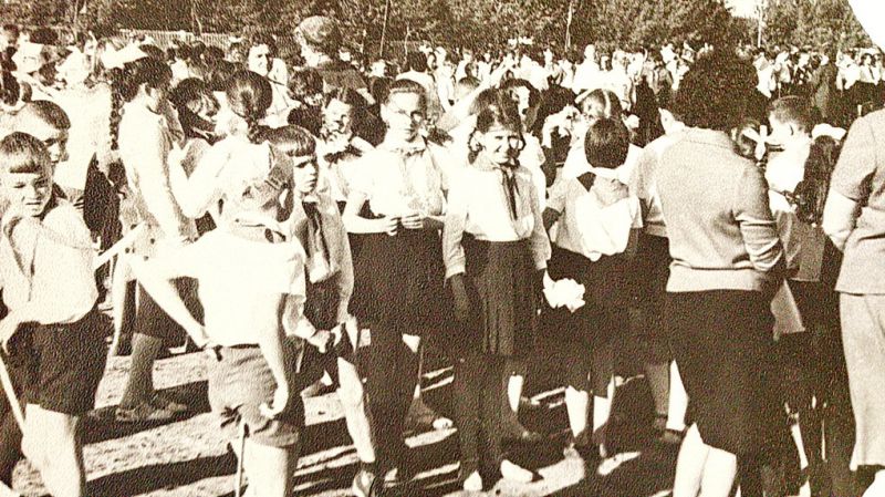 наш 4-А класс во дворе школы, в центре - Мамаева Наташа и я